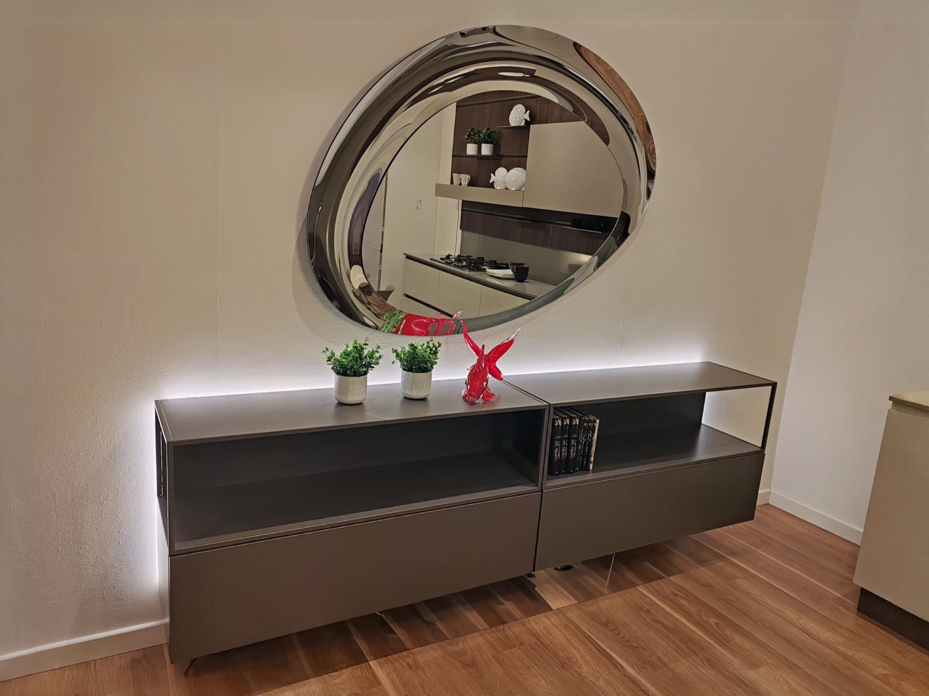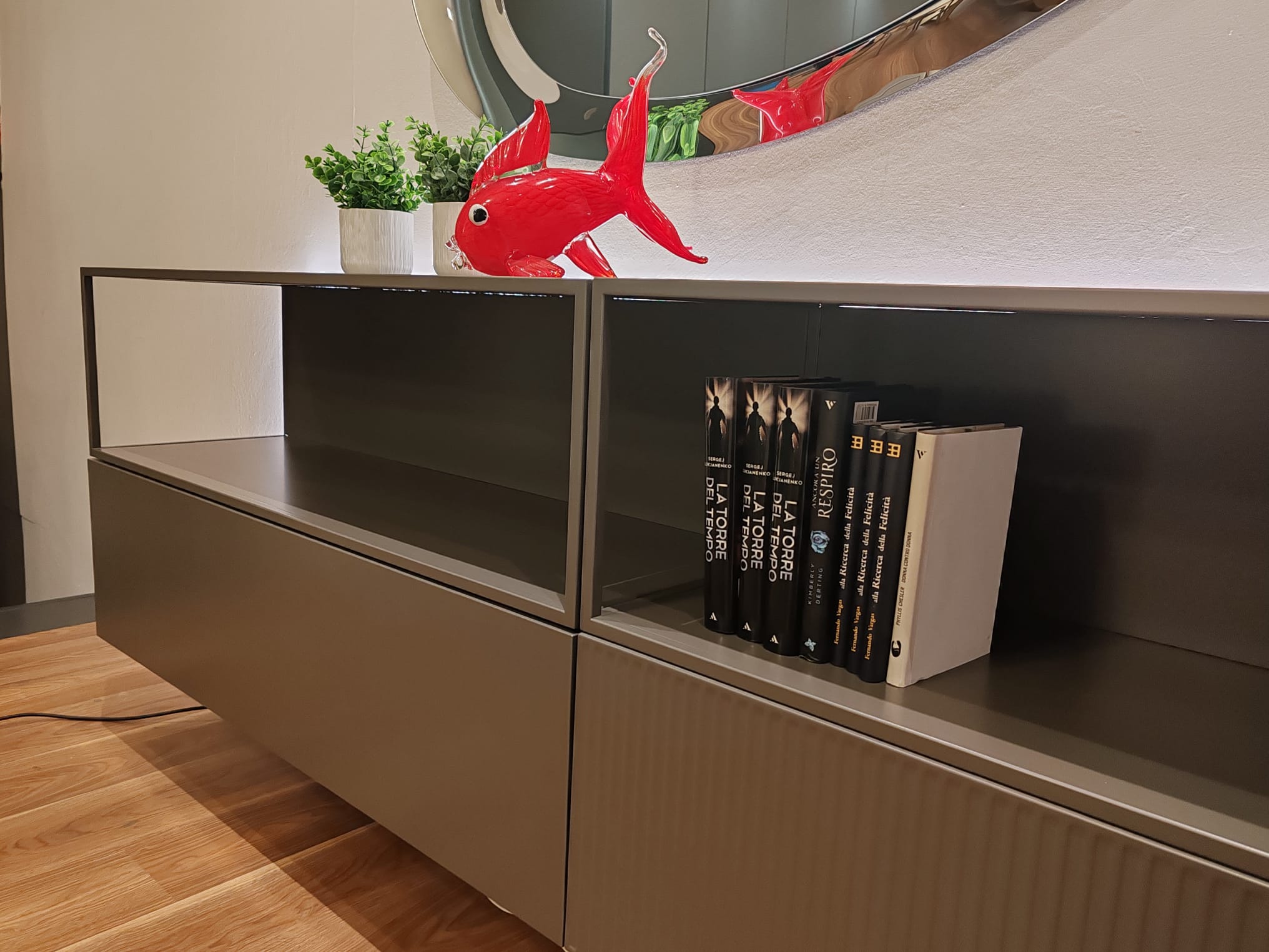 Madia laccato opaco con ante rigate e vetrine led Misure: lunga 240 cm prof 46 cm alta 80 cm Materiali: legno laccato opaco tortora chiaro, ante vetro trasparente, zampe in metallo antracite.